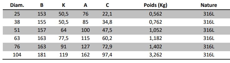 • Diamètres disponibles : DN25, DN38, DN51, DN63, DN76, DN104